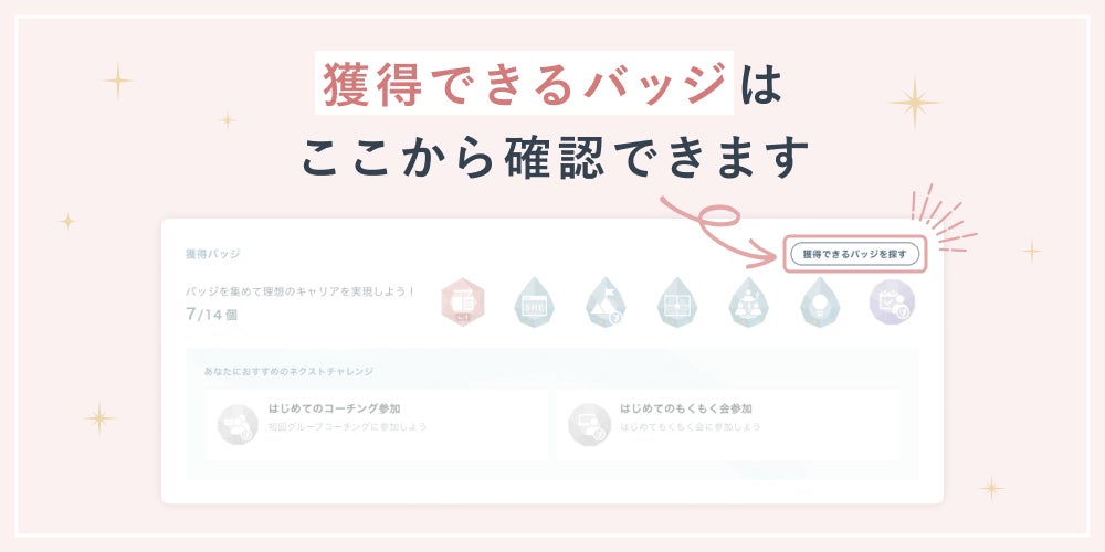 「バッジ」は、SHElikesの受講実績に応じて、特定の条件を満たすと獲得できる新機能です。日々の学習進捗や獲得スキル、お仕事チャレンジなどの成果を可視化することで、学習計画や習慣化をサポートします。