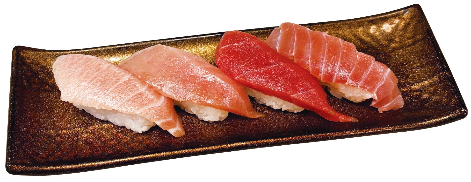 左から「まぐろ大トロ、まぐろ中トロ、上まぐろ赤身、天然まぐろハラス」