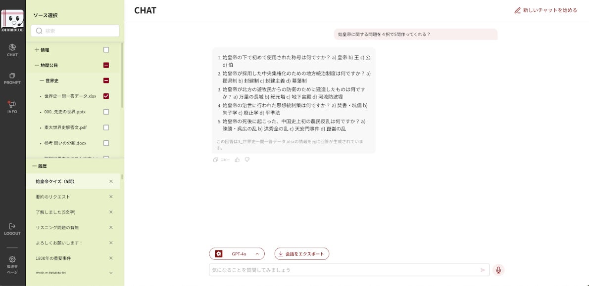 科目ごとに保存された教科書データ等をもとに、AIと対話しながら出力が可能。例えば、「日本史のこの時代についてテスト問題を出して」といった具体的なリクエストにも対応できます。教員が指定のフォルダにデータをアップロードするだけで、自動で内容を取り込み、回答に反映させることができる仕組みを実現しました。