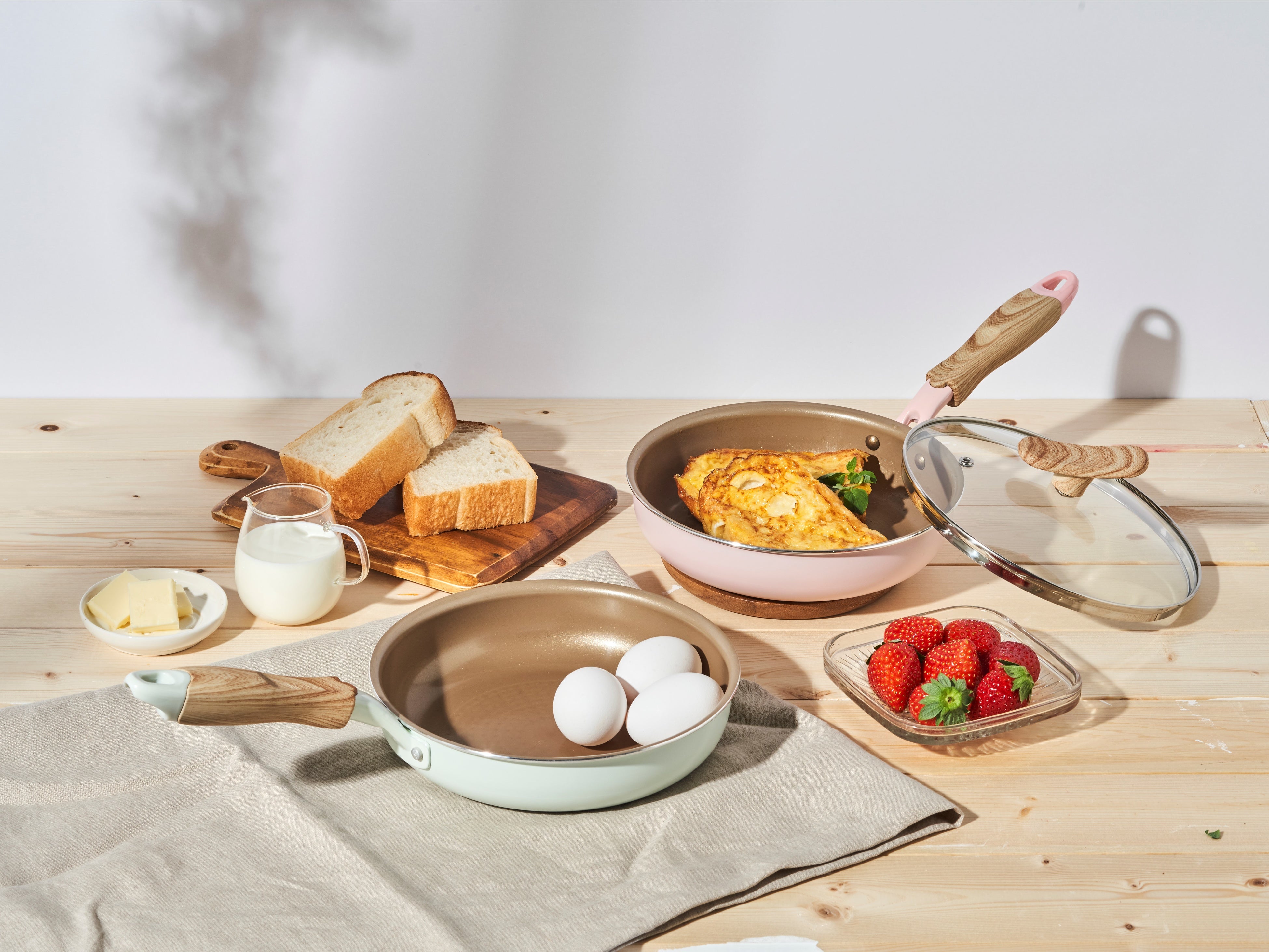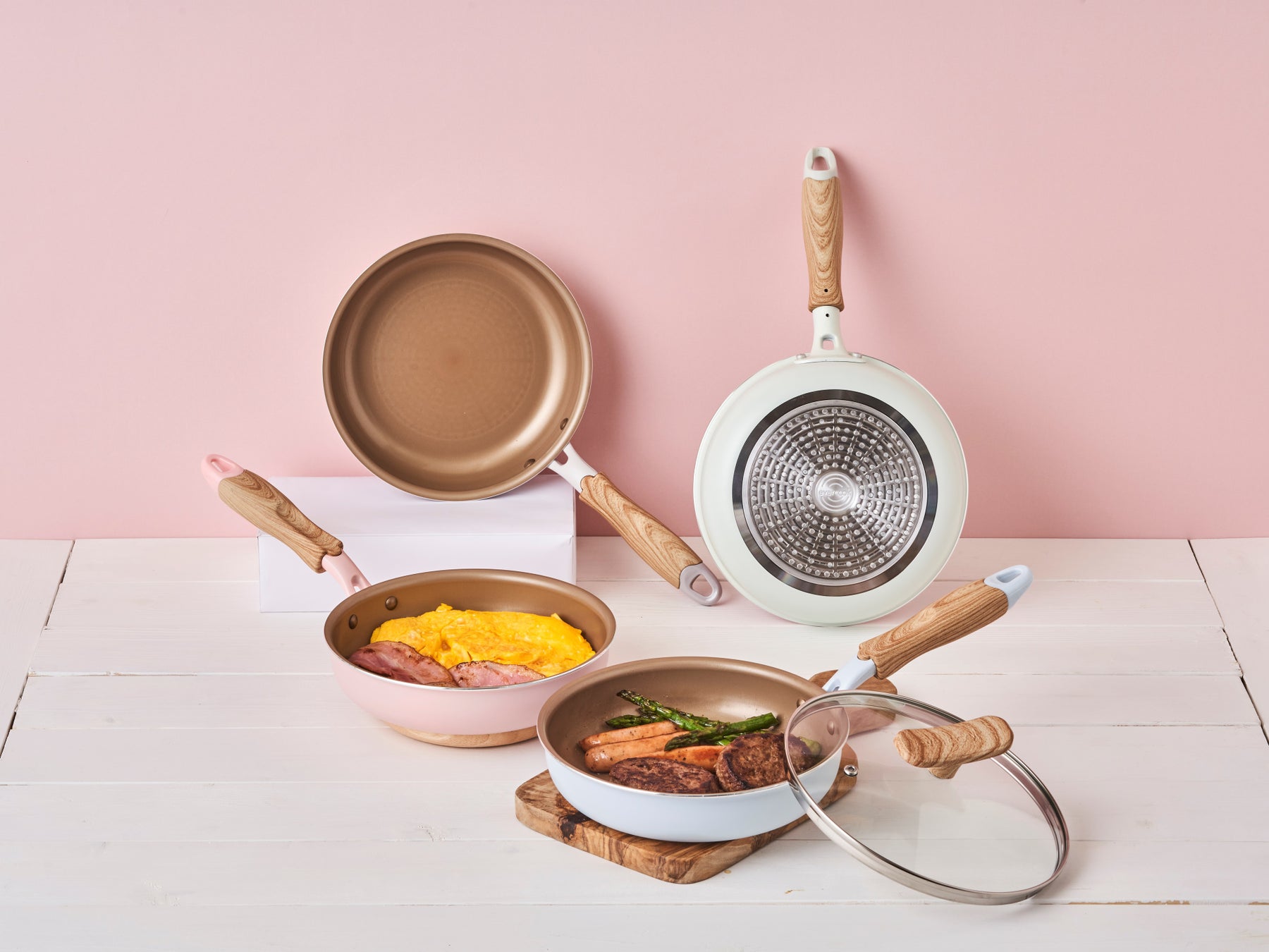 春らしくかわいらしいパステルカラーの外面に、シャンパンゴールドの内面がキッチンを明るくします。また、フライパンのハンドルとガラスふたのつまみ部分はナチュラルウッドカラーの木目が転写されており、温もりのあるキッチンを演出します。
