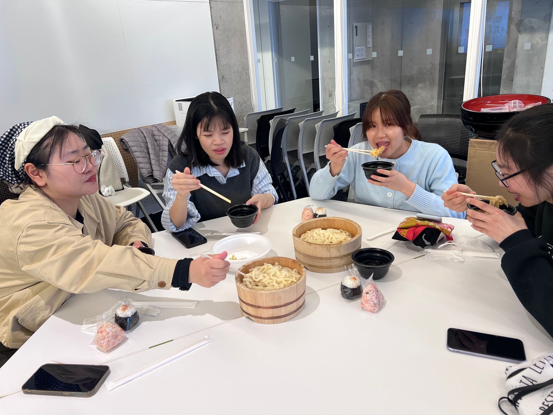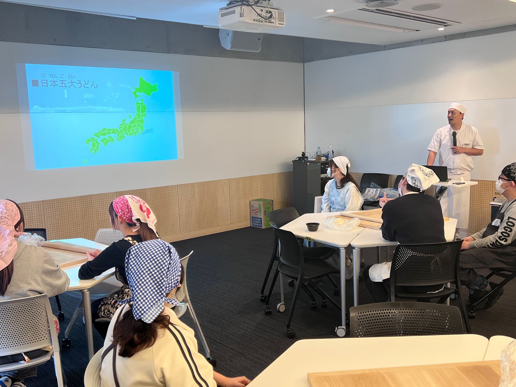 横浜商科大学では、日本人学生が外国人留学生の日常生活や学習をボランティアでサポートを行う「留学生バディー制度」を導入しています。この度、大学側で「留学生バディー制度」に参加する学生たちに、日本食(日本の文化)の学びや日本人学生との交流を深めてもらうことを目的にうどん教室を開催しました。