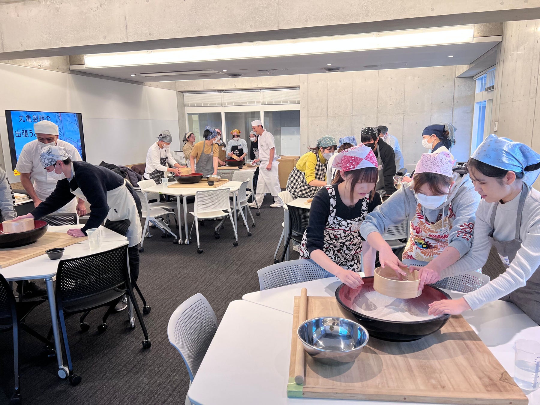 教室では、丸亀製麺独自の麺職人制度に合格した「麺職人」の称号を持つ従業員が講師を務め、小麦粉と塩と水を使ってうどんを手づくりしました。うどんの歴史や「日本五大うどん」と呼ばれるご当地うどんの紹介などうどんに関するレクチャーも実施しました。