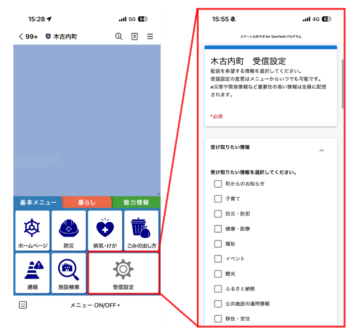 特にごみ収集日のお知らせ配信機能では、「ごみの種別」や「お住まいの地区」を入力すると、各地区のごみ収集スケジュールに応じて、収集日の当日にリマインド通知を受け取ることができます。