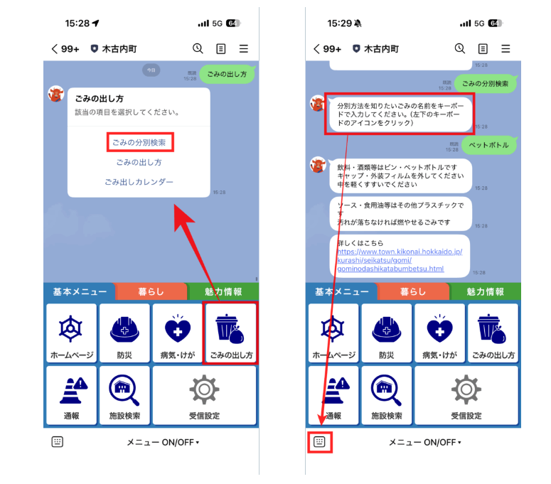 「ごみの出し方」では、「ごみの一問一答機能」を搭載しております。LINEのトーク画面に直接「ペットボトル」「乾電池」などの破棄したいごみの具体名を入力することで、分別方法や捨てる際のポイントを自動返答します。