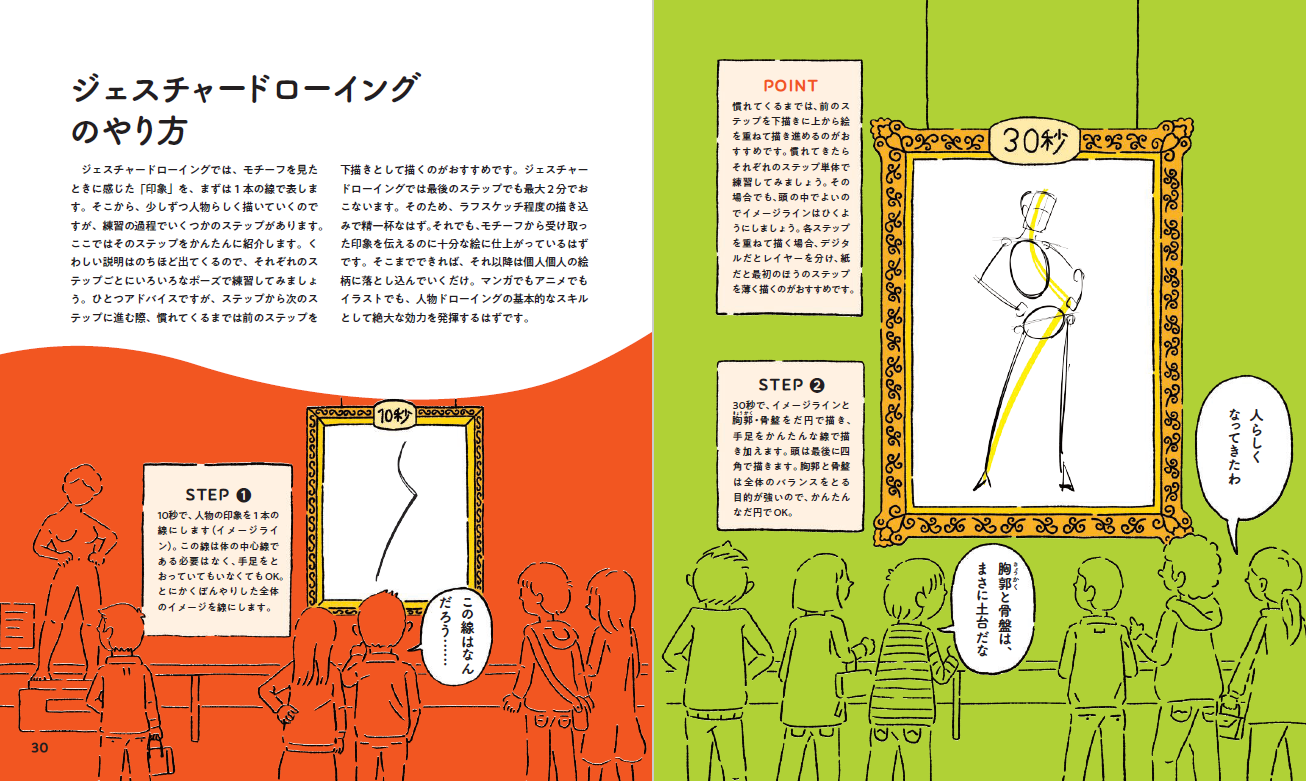 「ジェスチャードローイング」とは、理論にとらわれず、モチーフから受けた印象を表現することを優先した絵画技法。著者のたきみやさんはこのジェスチャードローイングとの出会いによって、動きのある印象的な人物が描けるようになり、現在は芸術大学での採点講師も務めています。