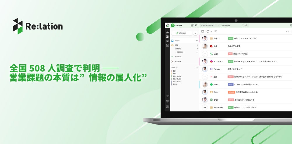 こうした課題に対し、インゲージが提供する顧客対応クラウド「Re:lation(リレーション)」は有効な解決策となります。Re:lationは、メール、電話、SNS、チャットといった複数チャネルの顧客対応を一つの画面で一元管理・可視化することができ、情報のブラックボックス化を根本から解消します。