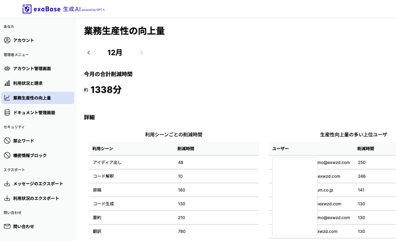 「exaBase 生成AI」ユーザーごとに業務生産性の向上効果を可視化する機能を搭載