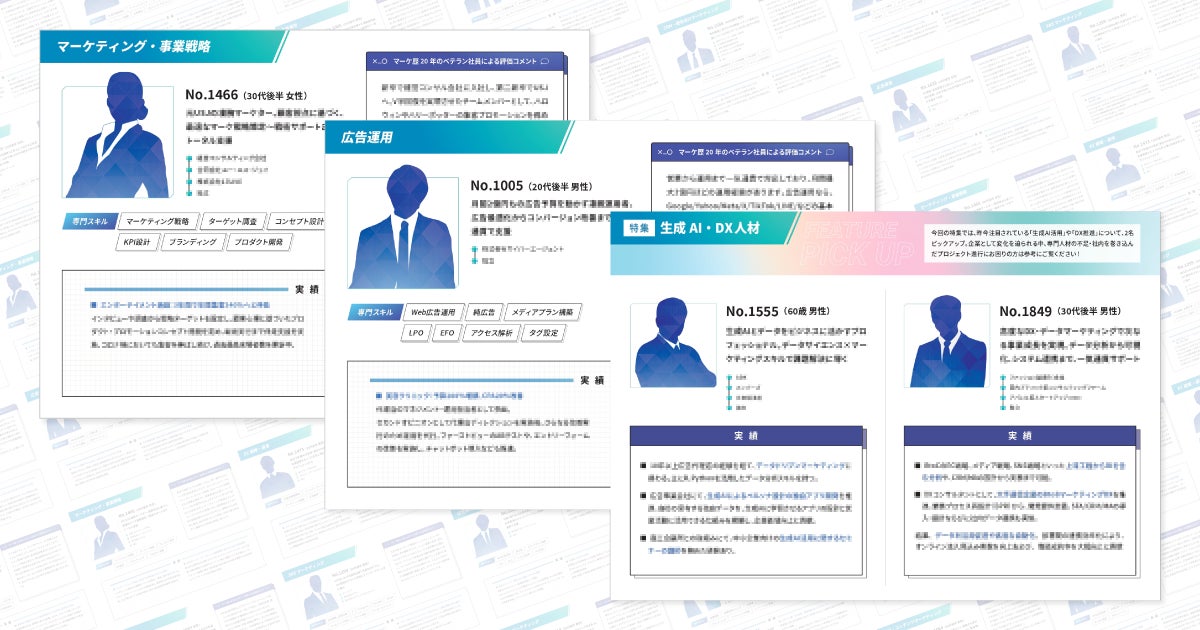 また、第3弾の特別企画として、今注目のDX人材と生成AI人材も掲載しています。デジタル人材不足が叫ばれる中、外部の専門人材の活用が企業の成長を加速させる鍵となってきています。自社の事業を拡大するために必要な人材がきっと見つかるはずです。今後も定期発行してまいりますので、ぜひご覧ください。