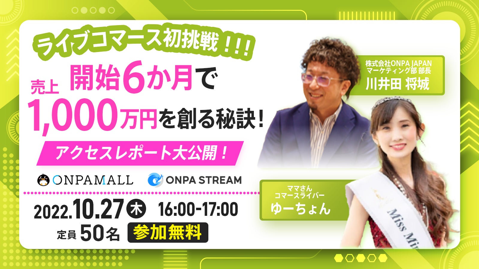 株式会社ONPA JAPAN(東京都渋谷区、代表取締役:恩地 佑亜 /以下、ONPA JAPAN)が定員50名限定で無料オンラインウェビナーを10/27(木)16時より開催いたします。ライブコマースをご検討中・よりよいライブ配信企画をお考えの企業様向けウェビナーです。
