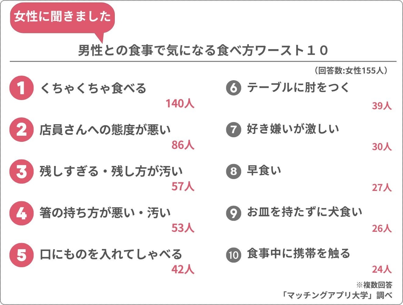 気になっていた男性がいたがラーメンを食べに行った時に肘をついたまま麺を啜って、くちゃくちゃ食べながら話されたので品がないと感じた。(埼玉県・20代) |