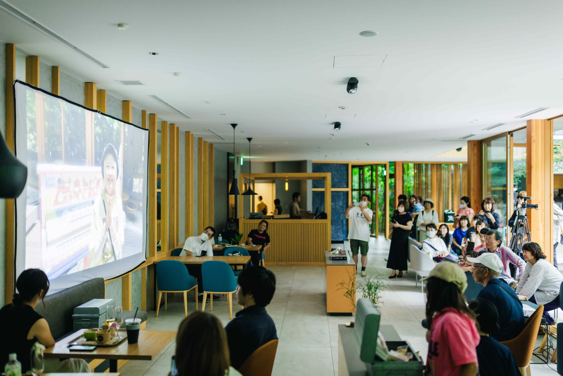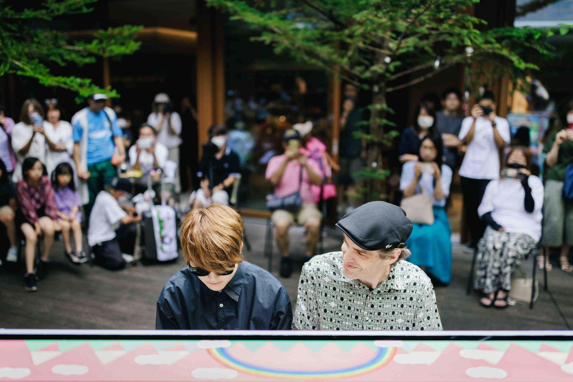 フィナーレイベントは、深緑を感じられるパブリックスペース「TAMARIBA(タマリバ)」の中庭で開催しました。スペシャルゲストとしてピアニストのよみぃ氏とJacob Koller氏が登場!Jacob氏のソロから始まり、お二人が出版された連弾楽譜集の曲や、最後のリクエストリレー曲、アンコールなど計6曲を披露し、会場全体が特別な雰囲気に包まれました。イベントの最後には、旅するLovePianoを各地で演奏された方々からの温かいメッセージが流れ、約一年をかけて全国各地を巡ってきた「旅」のクロージングを迎えました。