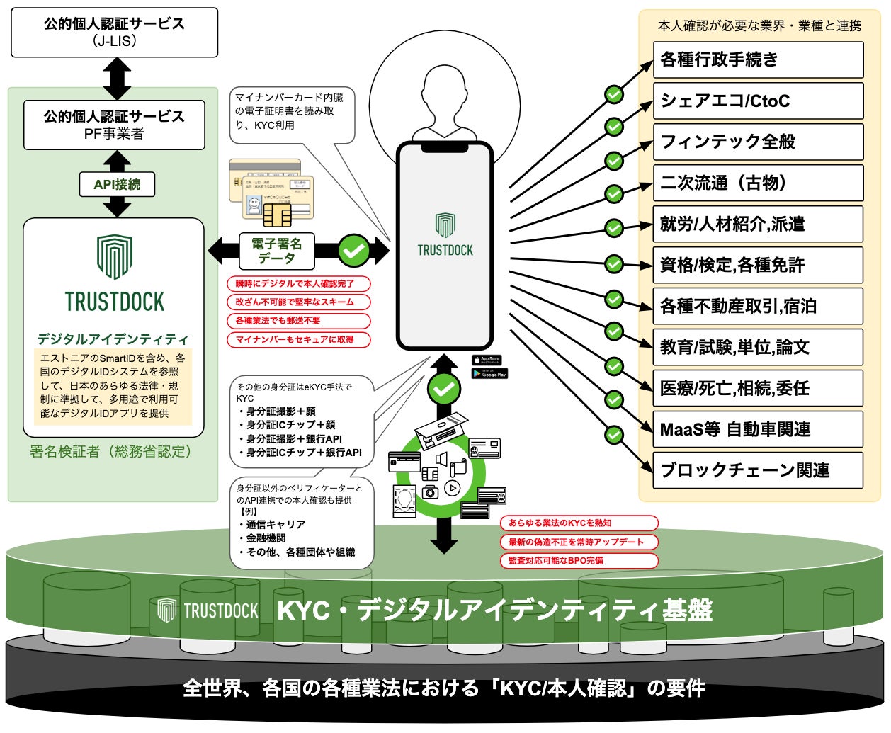 株式会社TRUSTDOCKは、マイナンバーカードの公的個人認証をはじめ、犯罪収益移転防止法のeKYCが可能なデジタル身分証アプリと、あらゆる業法に対応するKYCのAPI基盤サービスを提供する、日本で唯一のKYCの専門会社です。eKYC導入社数No.1(※1)のリーディングカンパニーとして、外部の有識者による「デジタル社会の本人確認に関するアドバイザリーボード(※2)」を設置するなど、国内外を問わず、デジタルアイデンティティ&eKYC基盤の構築に向けて安心・安全なデジタル社会のインフラ構築を推進しています。