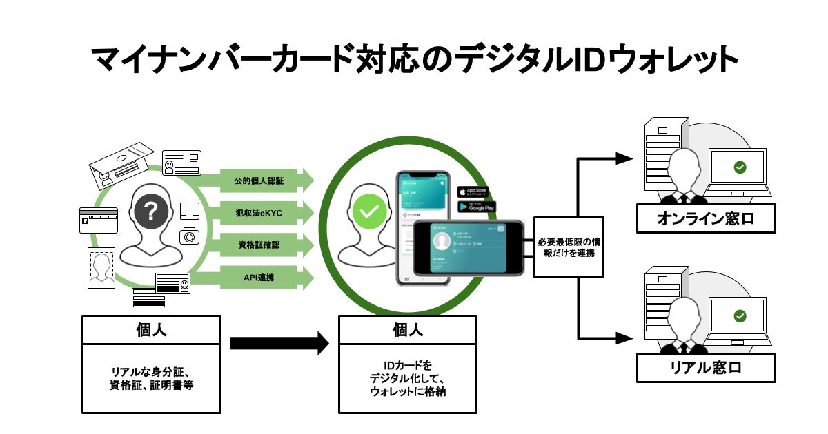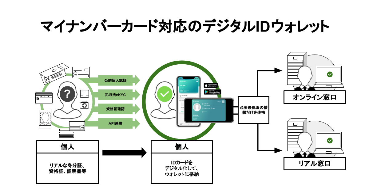 マイナンバーカードが活用できるデジタルIDウォレットを提供しており、事業者はスマートフォンのネイティブアプリを開発しなくても、マイナンバーカードを自社サービスで活用可能です。すでに各所で利用実績がある「TRUSTDOCK」アプリをはじめ、自社アプリに組み込める公的個人認証SDKなど、事業者の環境に合わせて、最適なマイナンバーカード活用ソリューションを提供しています。