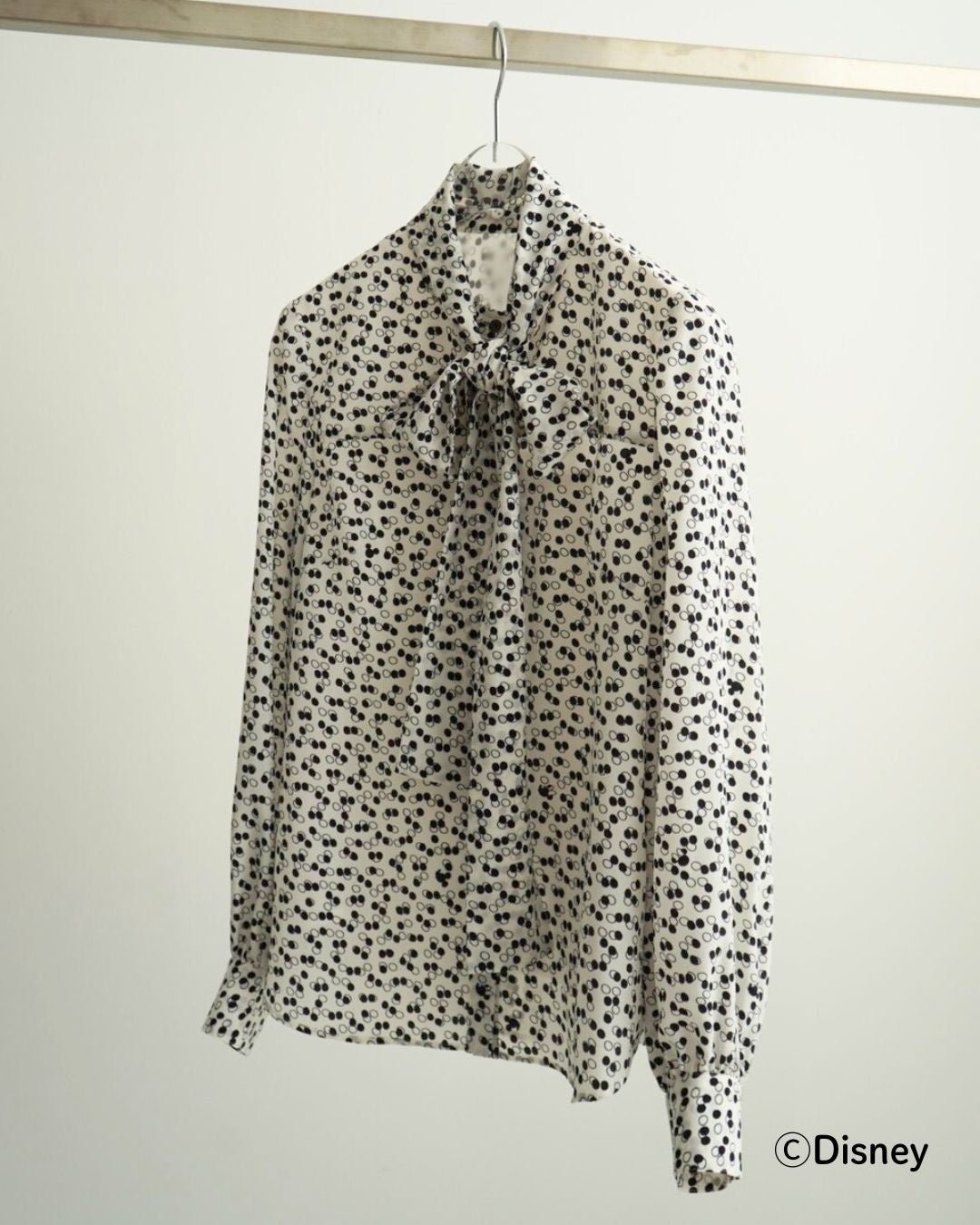 ドット柄に隠れミッキー&ミニーがプリントされたボウタイブラウス。柔らかなデシン素材を使用しています。ボウタイは取り外しが可能でアレンジもできるデザインです。