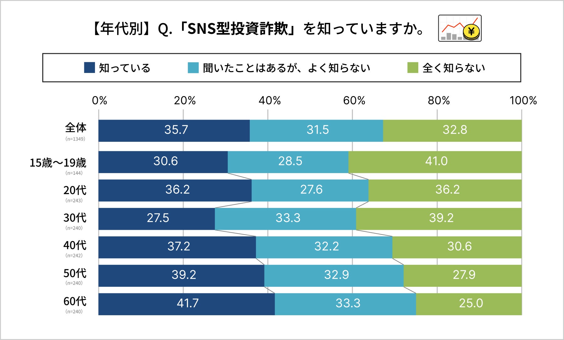 年代ごとの認知度に著しく大きな差はないものの、SNS型投資詐欺の被害が多い年齢層である40代〜60代で相対的に認知度が高い傾向があります。