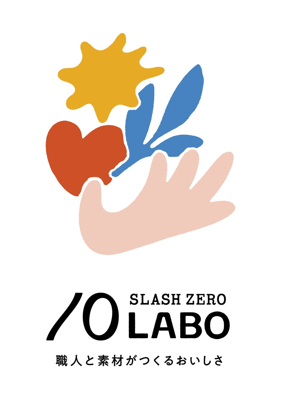ロゴマークは、スラッシュゼロ ラボがめざす「おいしい」の在り方を表しています。赤いハートは「職人の真摯な思い」。青い葉は「厳選した素材」。黄色は「お客様の心地よいひととき」。おいしさを作るには欠かせない3つの要素を、職人の手が支えている様子を表しています。