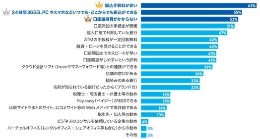 「24時間・365日振込可能(55%)」、「口座維持費無料(53%)」が上位。
