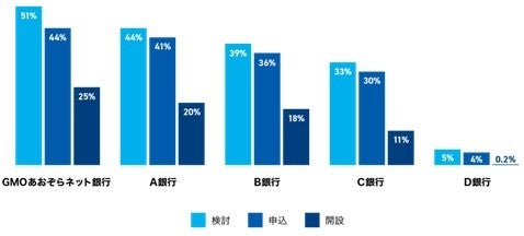 ●ネット銀行において、法人口座開設を「検討した割合」「申込を行った割合」「実際に開設した割合」を調査。