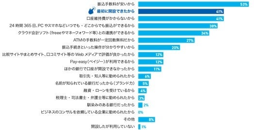 次いで「口座維持費無料(41%)」、「最初に開設できた/口座開設スピード(41%)」、