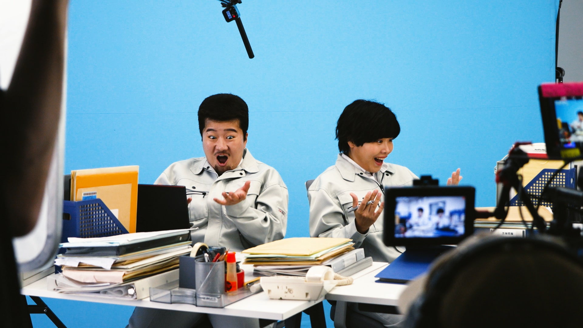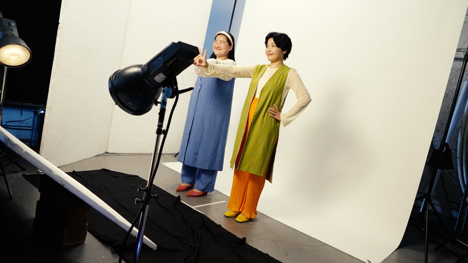 よしこさん、まひるさんが二人で演じるシーンは、お互いに声を掛け合ったり、表情やセリフの言い回しを何度も練習したりする姿が見られました。「ブイ!」の決めポーズを作るシーンは、最初は少し苦戦していましたが、最後には息ピッタリで見事にポーズが決まり、お二人のチームワークの良さを感じられる場面もありました。台本にはないアドリブのセリフもたくさん飛び出し、現場の笑いを誘い、終始明るい雰囲気で撮影は順調に進みました。