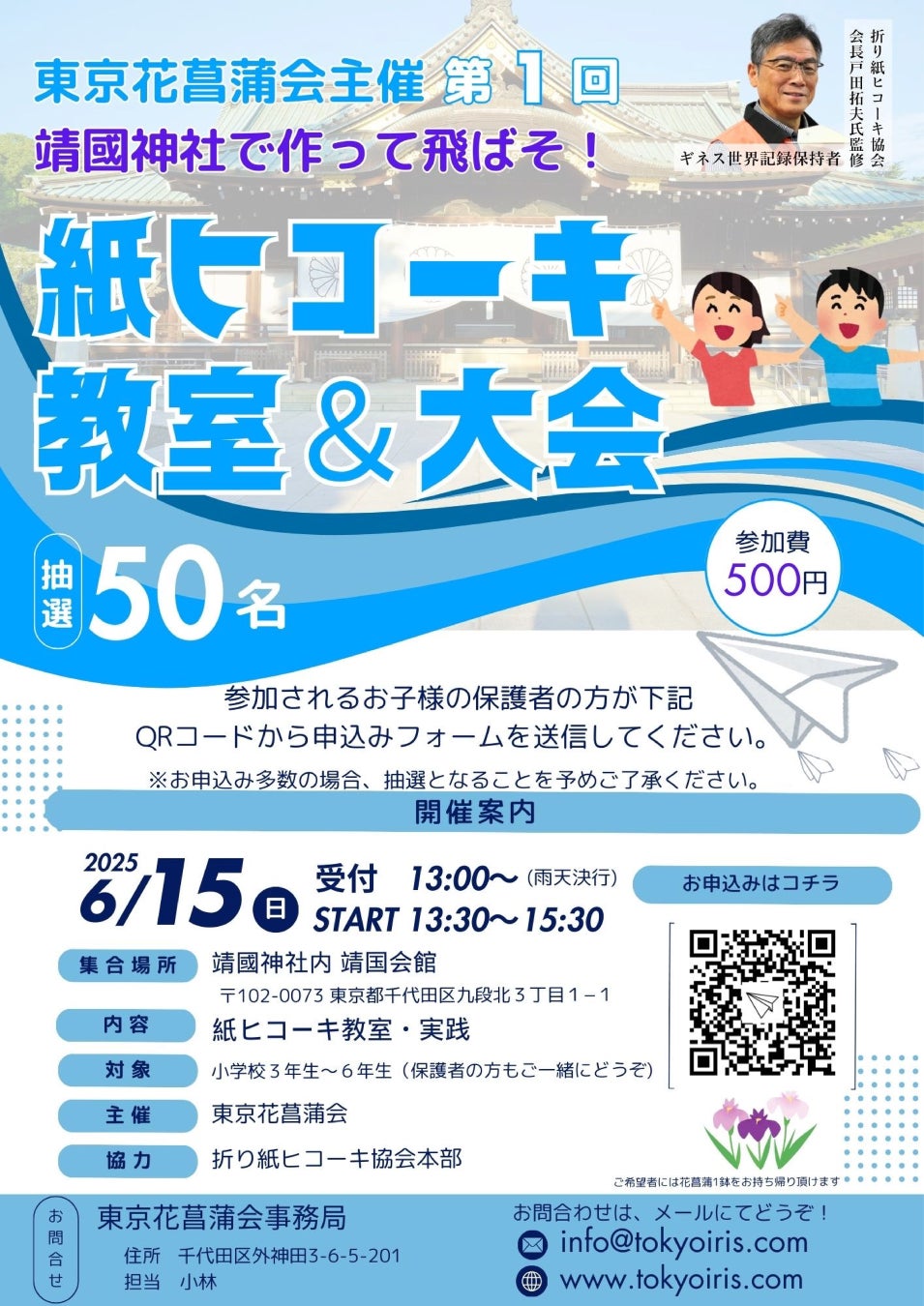 靖國神社を拠点に花菖蒲の展示や地域イベントに取り組む東京花菖蒲会(東京都千代田区、会長:小林孝也)は、2025年6月15日(日)に靖國神社にて、小学生を対象にした「紙ヒコーキ教室&大会」を初開催します。