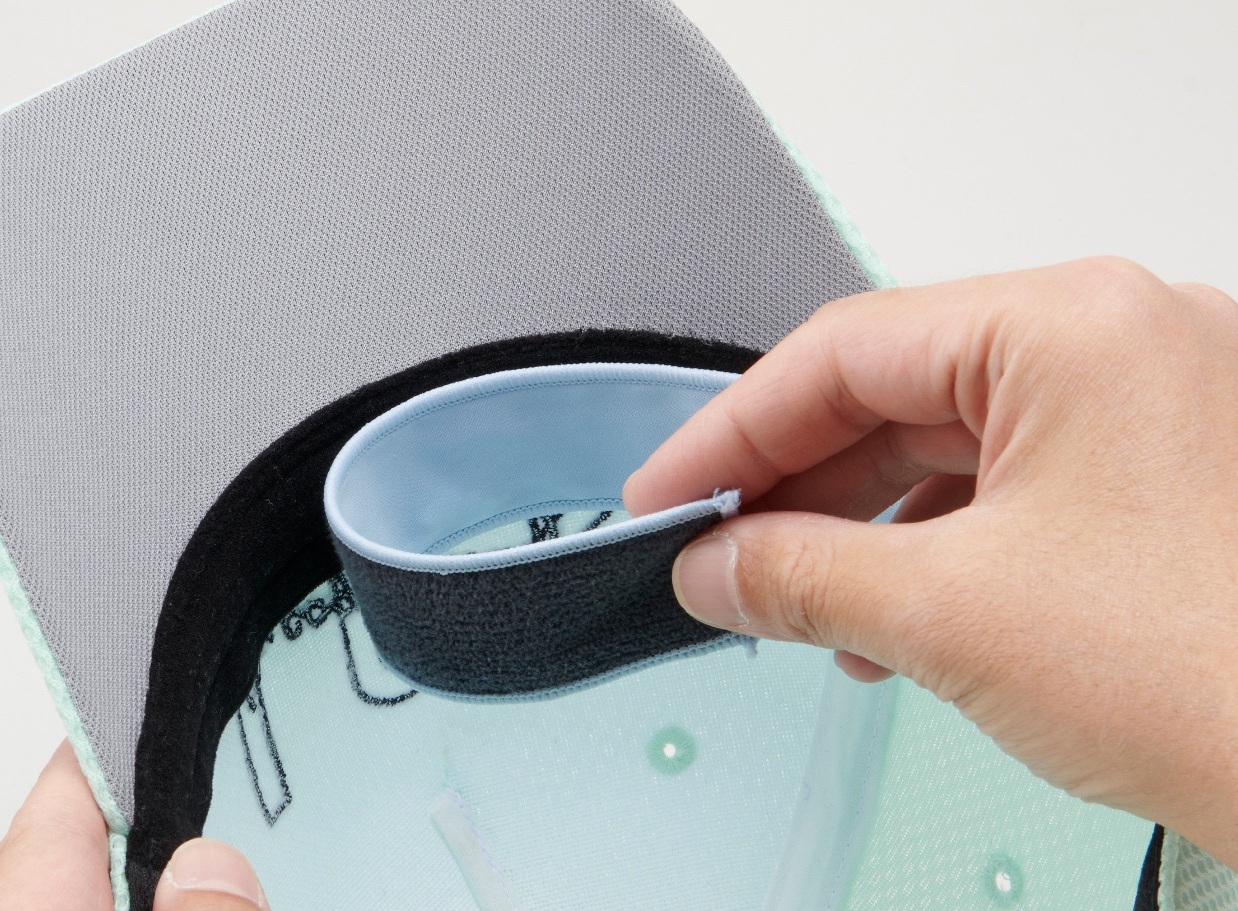 頭部の中でもダイレクトに冷たさが伝わりやすい”おでこ”に、水で濡らすと冷感が得られる素材「マジクール®」*を配置することで、ひんやりと冷たく感じることへの満足感を高めることができます。面ファスナーで装着するだけの簡単な仕様で、取り外して手洗いすることもできるため、汗をかく季節でも清潔に保つことができます。また、通年での使用を想定し、「マジクール®」を外した状態でも着用できるよう面ファスナーの素材には柔らかく細かい繊維を使用し、肌あたりをよくする工夫をしています。