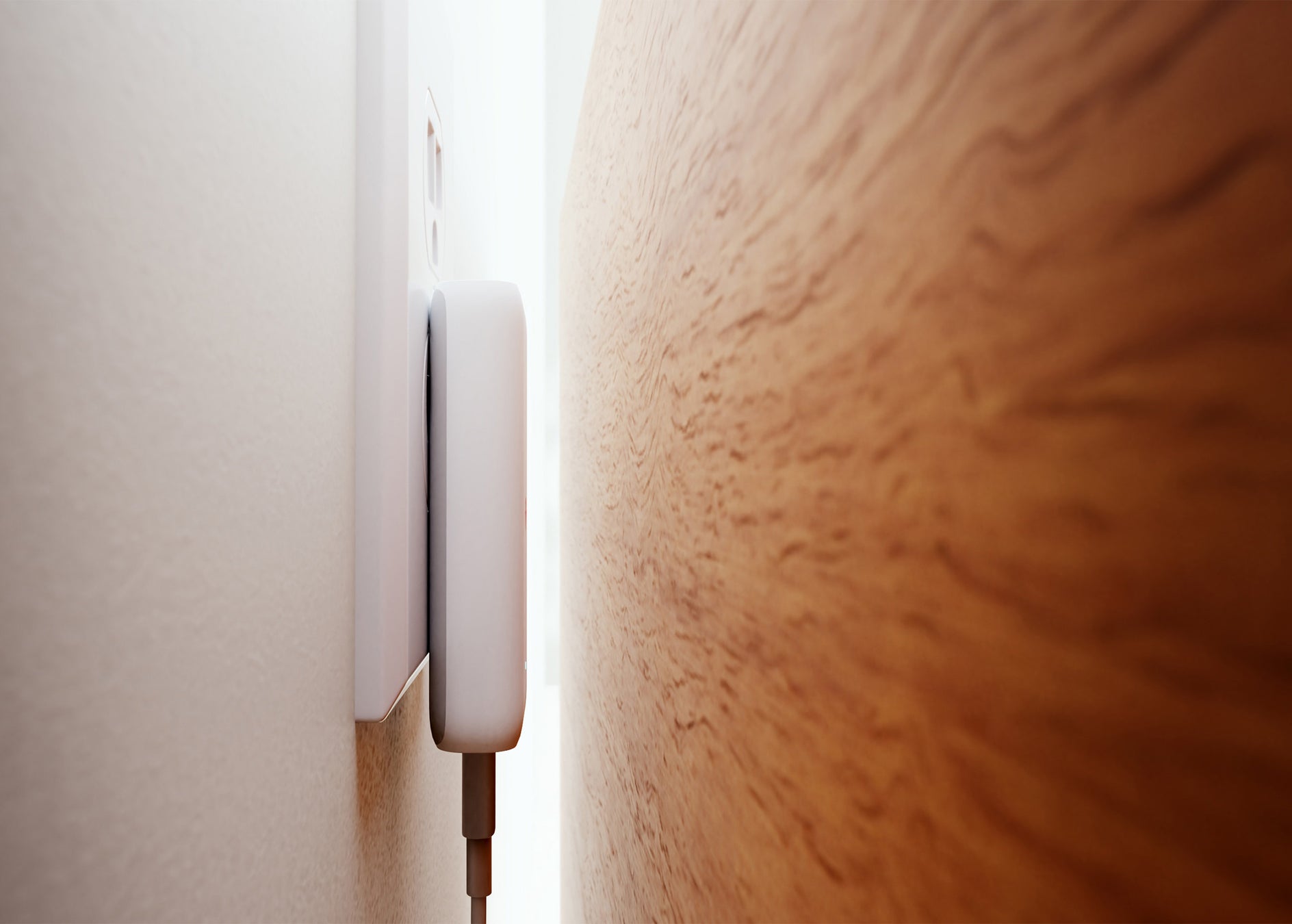 約17mmという薄さが特徴のPlugBug Slimは、iPhone、iPadの充電器を置く場所を確保するために、壁際の机やナイトテーブル、キッチンカウンターのトースターなどを動かす必要がありません。他社製の箱型充電器とは異なり、PlugBug Slimはコンセントと一体化するかのような設計。電源ケーブルは底面から接続します。