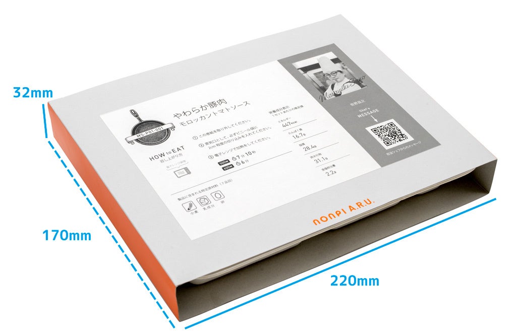 料理1個あたりの容器サイズは、幅22cm、奥行17cm、厚み3.2cmと薄型のため保管しやすくなっています。