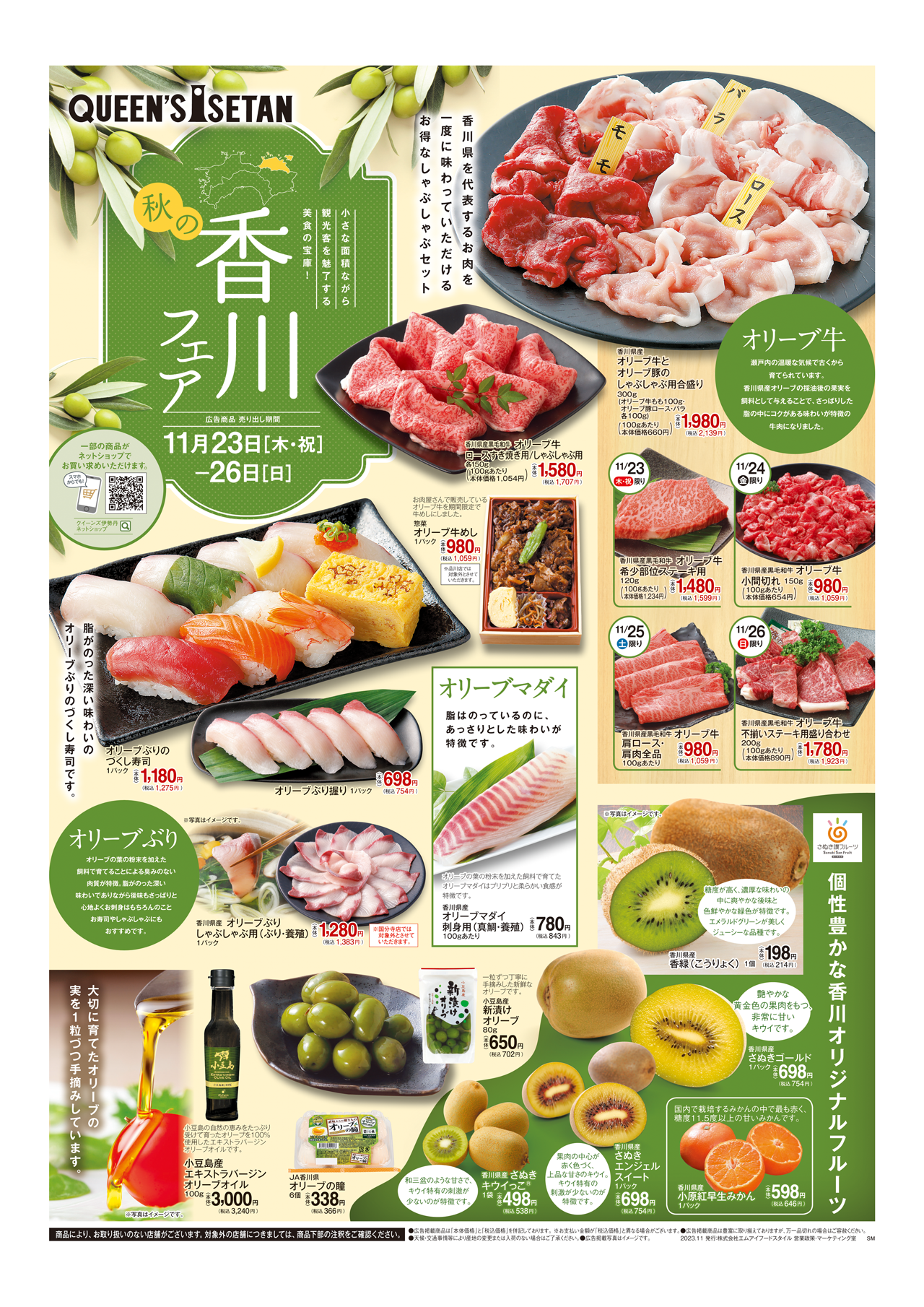 「秋の香川フェア」では、香川県産を主原料としたオリーブの一部を飼料として与えて育てた「オリーブぶり」や「オリーブ牛」をはじめ、「さぬきエンジェルスイート(キウイフルーツ)」、「オリーブの瞳(生卵)」など、香川の美味しいものが大集合!