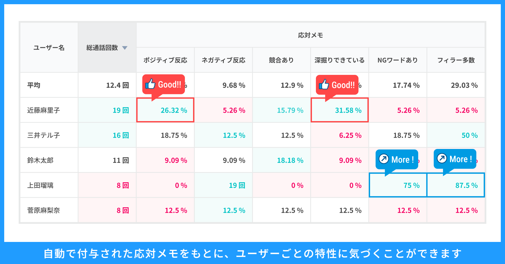 多くの企業に応対メモによるラベリングが活用される一方で、ユーザーの応対品質(NGワードの発話、フィラーの多さなど)や顧客の反応(ポジティブな評価の声が上がっているなど)に関するラベリングについては、ユーザー自身での判断が難しく、従来の応対メモでは対応が困難な部分でした。そのため、「良い通話」「要注意の通話」を自動で抽出し、イネーブルメントに生かすことには課題がありました。