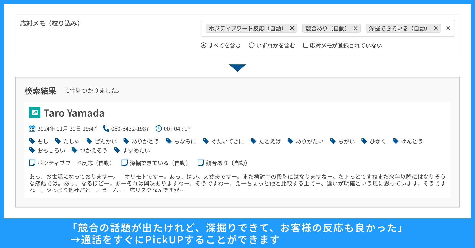 この結果、企業とお客様のラストワンマイルのコミュニケーションである「電話」で話された貴重なお客様の声を、手間をかけることなく必要なものだけ確認できるようになります。生成AIの普及に伴い、大量のデータを利用可能な状態で蓄積していくことの重要性がこれまでになく高まっており、このたびの機能追加は通話ビッグデータのアセット化の第一歩となります。