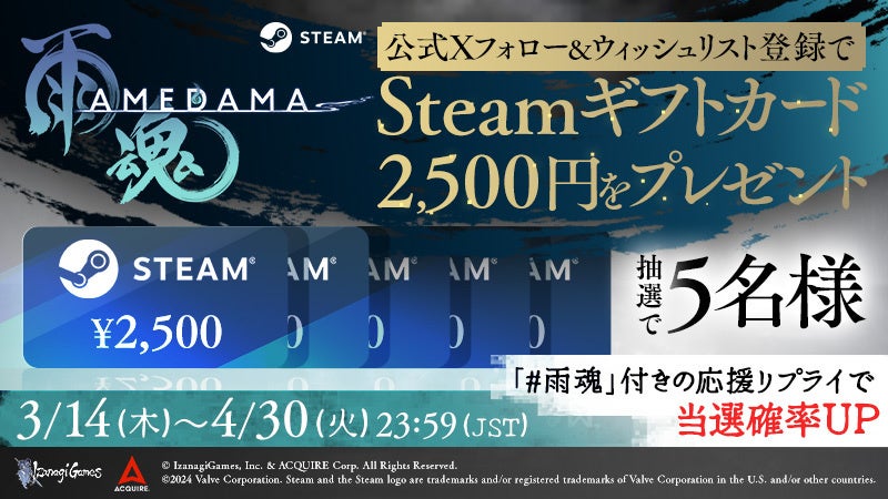 『雨魂 - AMEDAMA -』日本語公式Xアカウント:https://twitter.com/amedama_jpn をフォローし、Steamストアで「ウィッシュリスト登録」をされた方より抽選で、Steamギフトカード2,500円分を5名様にプレゼントいたします。