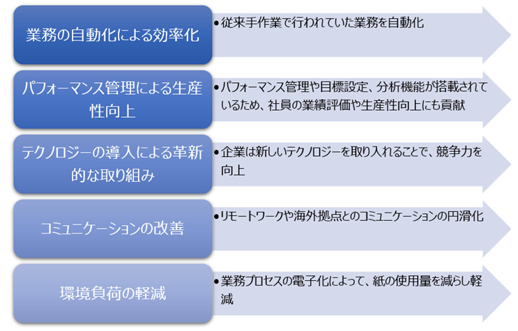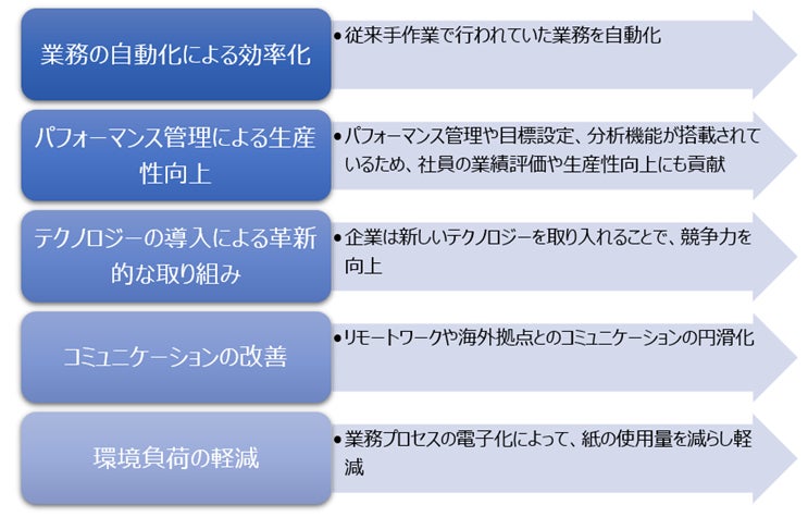WorkTechの重要性は、効率的な業務運営によって、時間とコストを節約できる点にあります。また、データに基づくパフォーマンス管理、目標設定、分析機能を提供することで、生産性を向上させることができます。これらの機能を使用することで、企業は、人事や経理などの間接部門で発生する手作業を削減し、より効率的に運営できるようになります。間接部門におけるデジタル化の促進によって、企業の業務プロセスを変革する力を持っています。