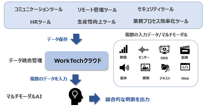 こうした課題を解決するために、WorkTechクラウド™では、複数のツールとデバイスからのデータであるマルチモーダルを統合管理し、マルチモーダルAIに活用を図ることができます。また弊社がご提供するAIデータドリブン経営のためのデータワンストップサービスを活用することによって、AIライフサイクルにおけるAI学習用データの収集、保管、管理、活用まで総合的なサービスをご提供することができます。
