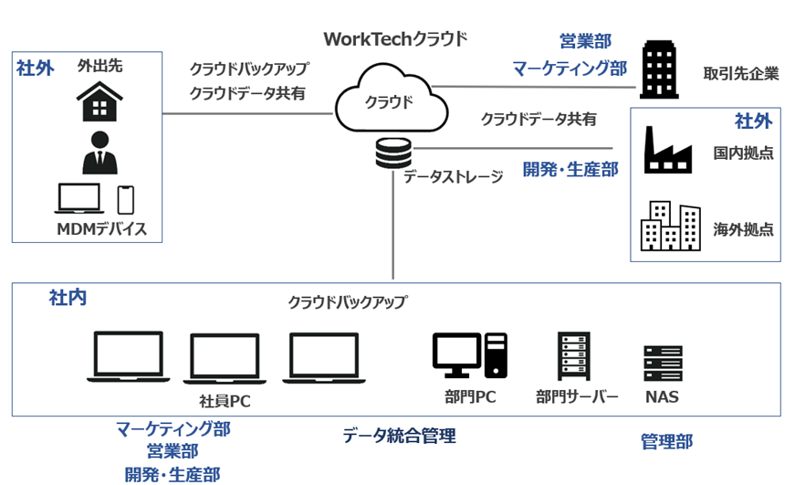 「WorkTechクラウド™」は、厳格かつ柔軟なアクセス権限管理機能や、ドキュメントへの検索用メタデータ付与によるデータ検索性の強化、AIデータ活用に向けたマルチモーダルAIへの対応、ファイルビューアー機能、暗号化および監査機能、バックアップ機能、および大容量長期保管向けアーカイブシステム機能を備えた、デジタルワークプレイス環境におけるすべての企業に向けて設計された、SaaSで提供されるクラウドストレージです。