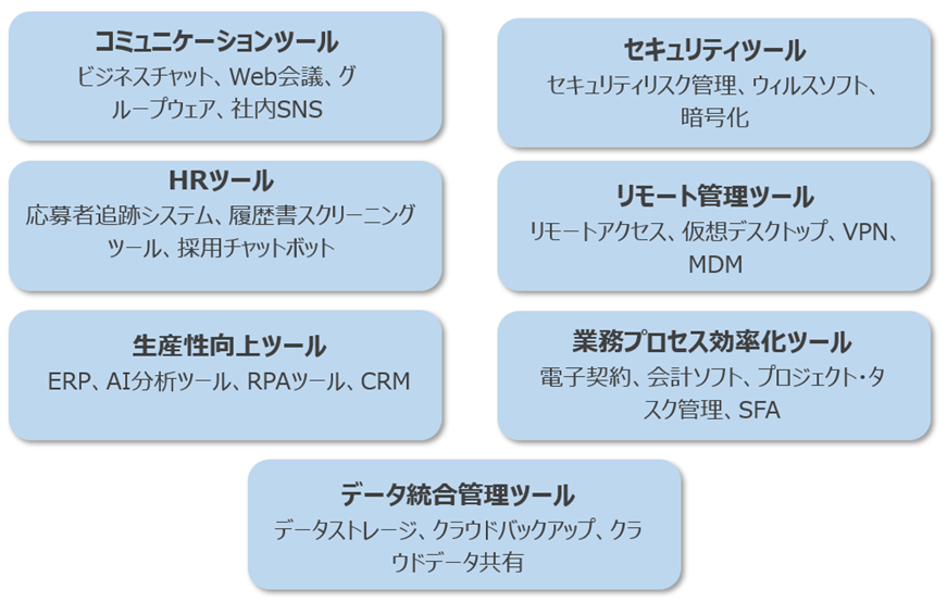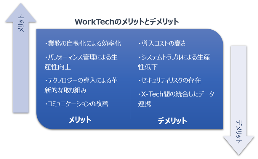 WorkTechにおけるデジタルワークプレイスを実現するための様々なX-Techのワークテックツールが存在をします。これらのツールにより、業務の効率化や生産性向上を図ることを目的としたワークスタイルがもたらされています。具体的には、電子メール、ビデオ会議、チャット、クラウドストレージ、グループウェア、プロジェクト管理ツールなどのITツールやサービスを活用して、場所や時間にとらわれずに業務を行うことが可能です。デジタルワークプレイスは、テレワークやフレックスタイムといった柔軟な働き方に対応し、従業員のワークライフバランスの改善にもつながっています。また、従来の文書管理に比べてセキュリティ面やバックアップ管理が容易になるなどのメリットもあります。