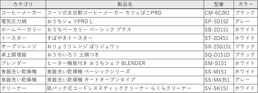 “挽く・蒸らす・淹れる”が全自動で、自宅で手軽に自分好みのコーヒーが楽しめる「コーン式全自動コーヒーメーカー カフェばこPRO」や、下ごしらえをした材料を入れてボタンを押すだけで手軽に本格料理が作れる電気圧力鍋「おうちシェフPRO L」、水分たっぷりのもちもち生地が特長の高加水パンやわずか58分で焼き上がる「超早焼きパン」などの幅広いメニューが楽しめるホームベーカリー「おうちベーカリー ベーシック プラス」など、全10製品が採用されました。