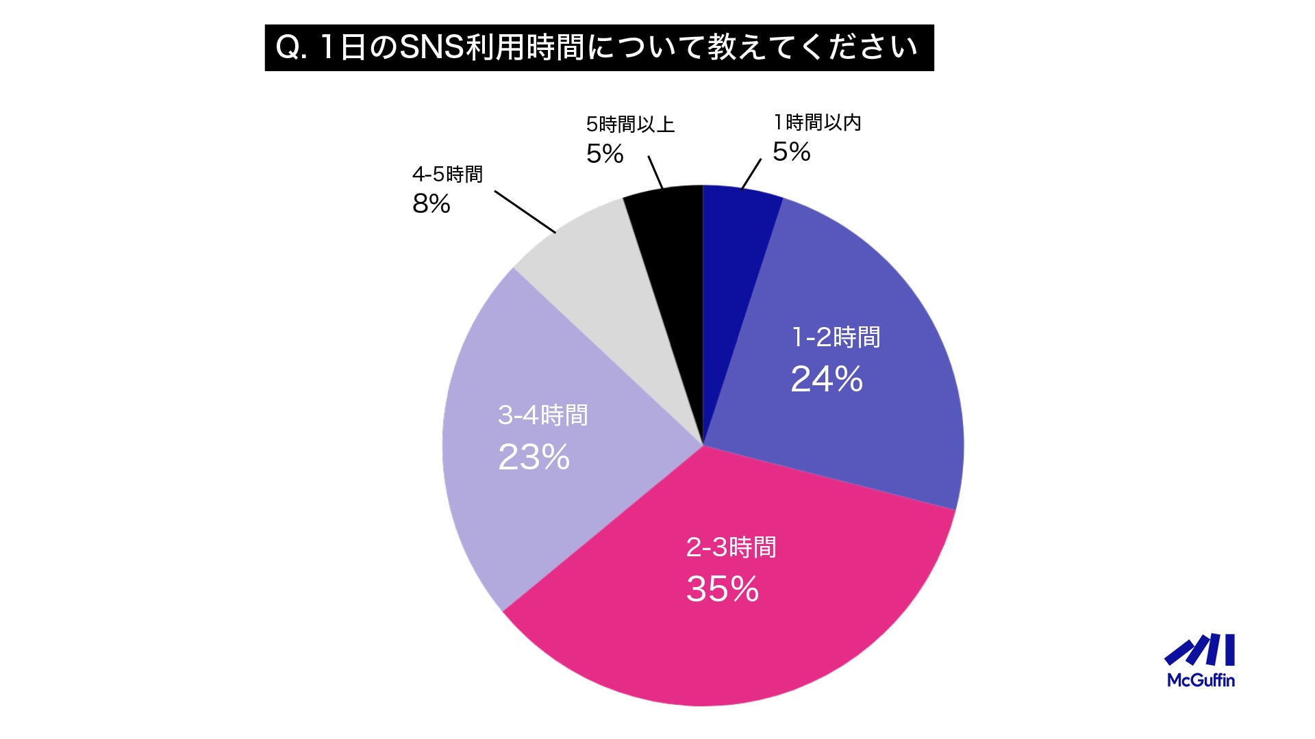 1日のうち、どれくらいの時間SNSを見ているかに関して、2-3時間と回答した方が全体の約35%と最も多く、次いで1-2時間が約24%・僅差で3-4時間が約23%という結果に。以上の結果から、仕事終わりや隙間時間などを活用しながら、SNSを利用している方が多いことが想定できます。また、全体の半数以上が1日3時間以上SNS利用に時間を費やしており、日常生活の一部として定着していることが分かります。