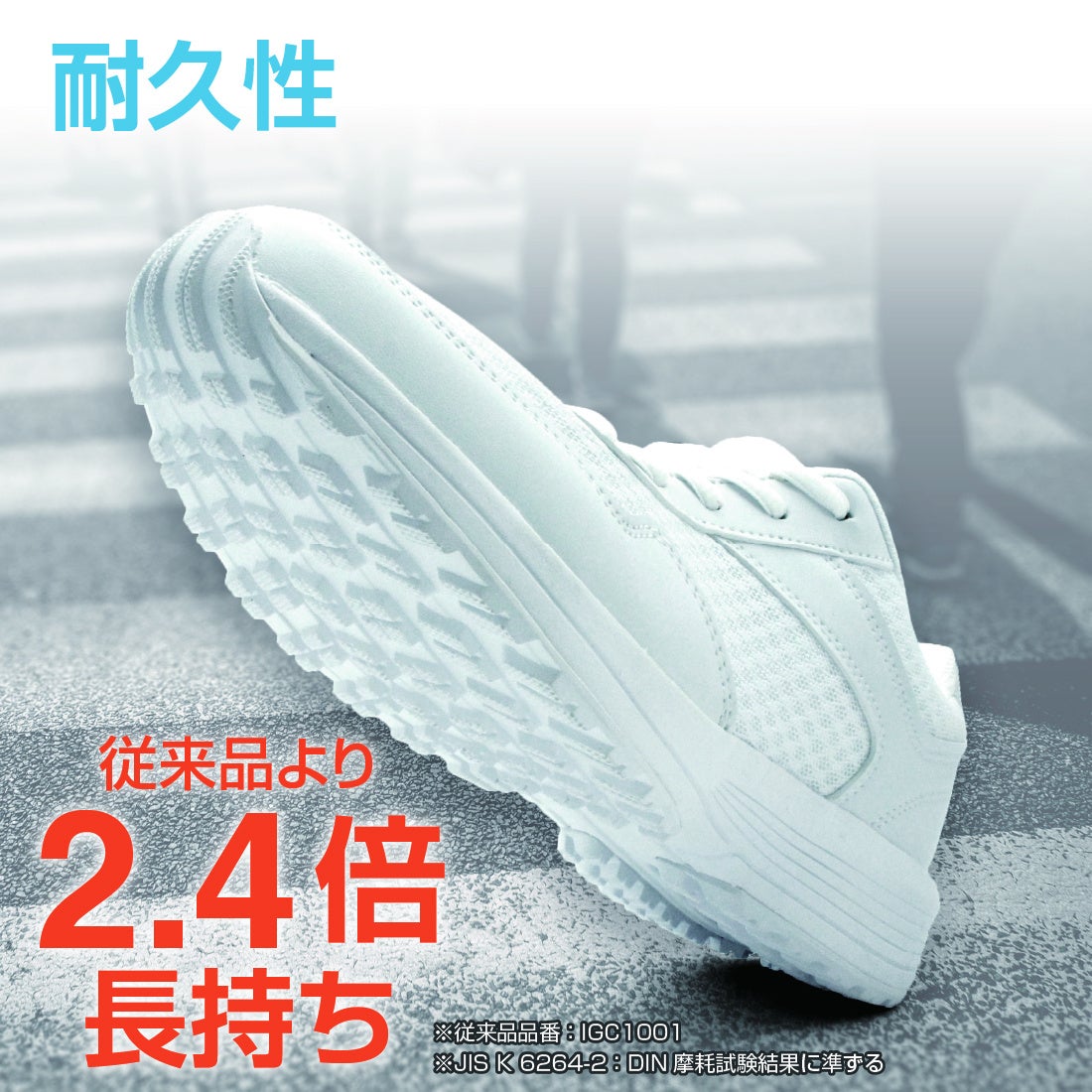 ※3 ソールの耐久性:従来品(品番:IGC1001) より約240%に向上 JIS K 6264-2:DIN摩耗試験結果に準ずる