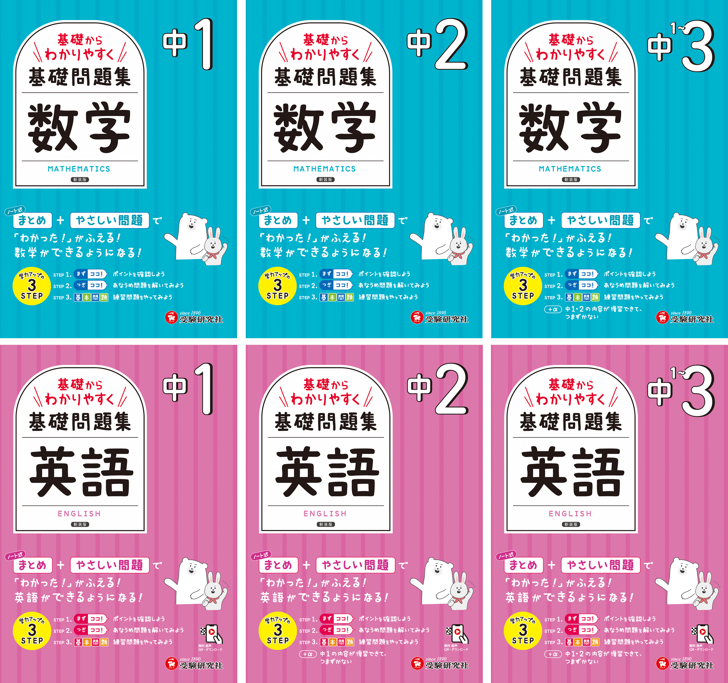 ノート式まとめ+やさしい問題。数学・英語それぞれ中1/中2/中1~3の3種類をラインナップ