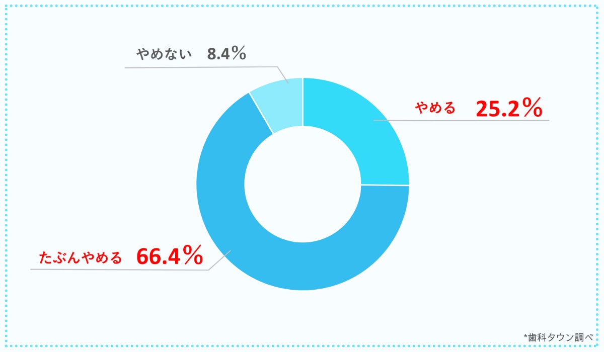 口コミには、良い評価もあれば悪い評価もあります。口コミの点数が低い歯医者さんだった場合、その歯医者さんへの通院を「やめる」と答えた人が25.2%、「たぶんやめる」と答えた人は66.4%を占め、合わせて91.6%もの人が口コミを参考に通院を判断していることが分かりました。