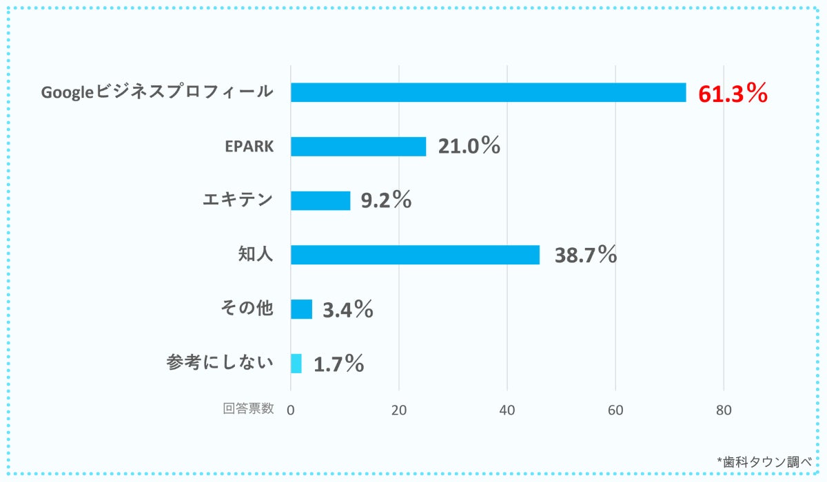 歯医者さん選びに「口コミ」が大きな影響を与えていることが分かりましたが、そのなかでも「Googleビジネスプロフィール」は61.3%と、最も参考にされていることがわかりました。次いで多かったのが、38.7%の回答を得た「知人」です。インターネット上の口コミを参考にする人が多いものの、リアルな知り合いからの評判は信ぴょう性が高いと考え、参考にする人が多いのではと推測されます。