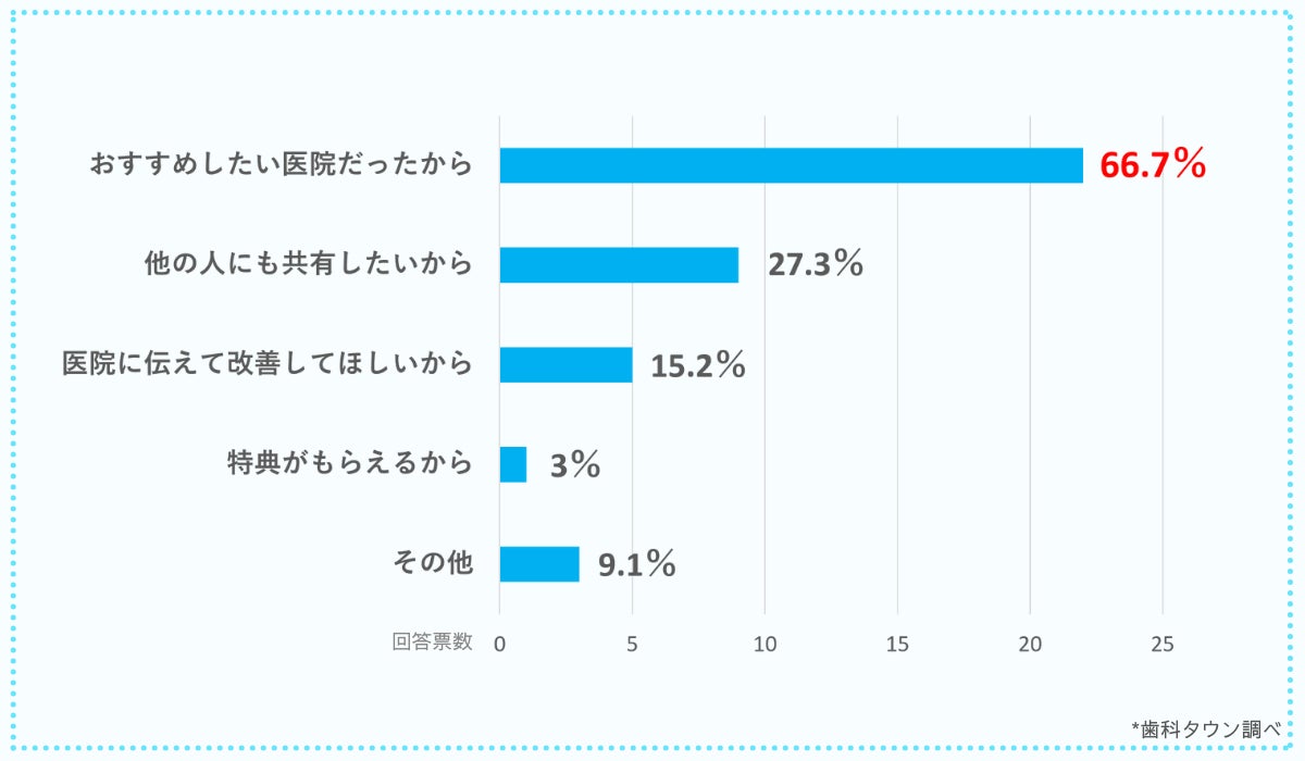 次に多かった回答は「他の人にも共有したいから」の27.3%であり、自分の感想を他の人の歯医者さん選びに役立ててほしいと考える人も一定数いることが伺えます。一方、「医院に伝えて改善してほしいから」と回答した15.2%の人は、歯医者さんに何らかの不満を感じていると考えられます。