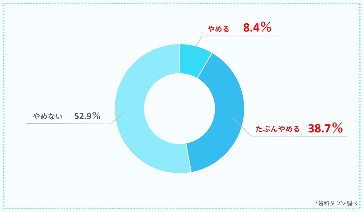 口コミが少ない歯医者さんへの通院を「やめる」と回答した人は8.4%、「たぶんやめる」と回答した人は38.7%となり、合計すると47.1%の人が、口コミの少ない歯科医院への通院は躊躇することが分かりました。この結果から、口コミの数も歯医者さん選びに大きな影響を与えると考えられます。