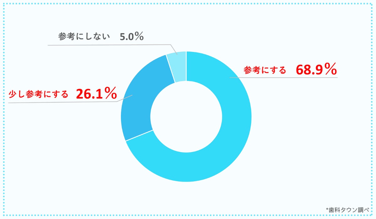 新しい歯医者さんを探す際に、口コミを「参考にする」と回答した人は68.9%。「少し参考にする」と回答した人は26.1%となり、合計するとなんと95%もの方が口コミを参考にしていると分かりました。「口コミ」は、ほとんどの人の歯医者さん選びに大きな影響を与えているようです。