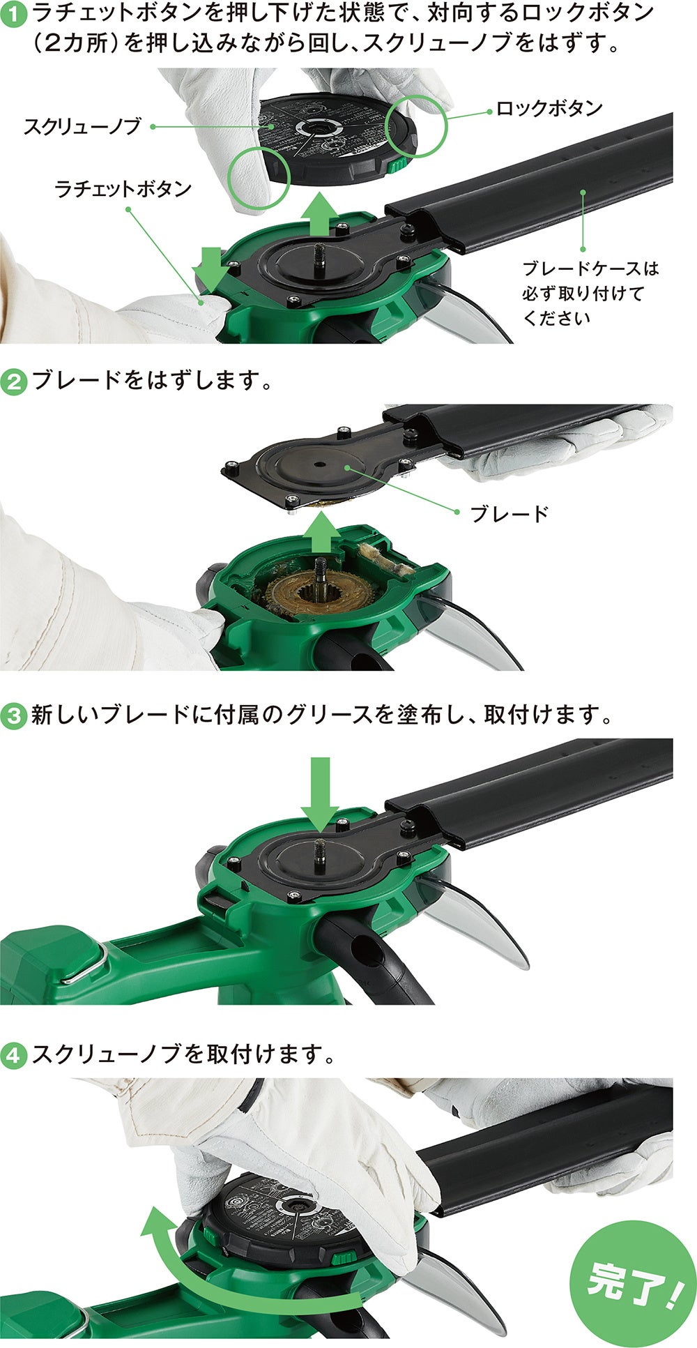別売りののこぎりブレードに交換すれば枝打ち作業、せんていブレードに交換すれば低木のせん定作業が可能です。