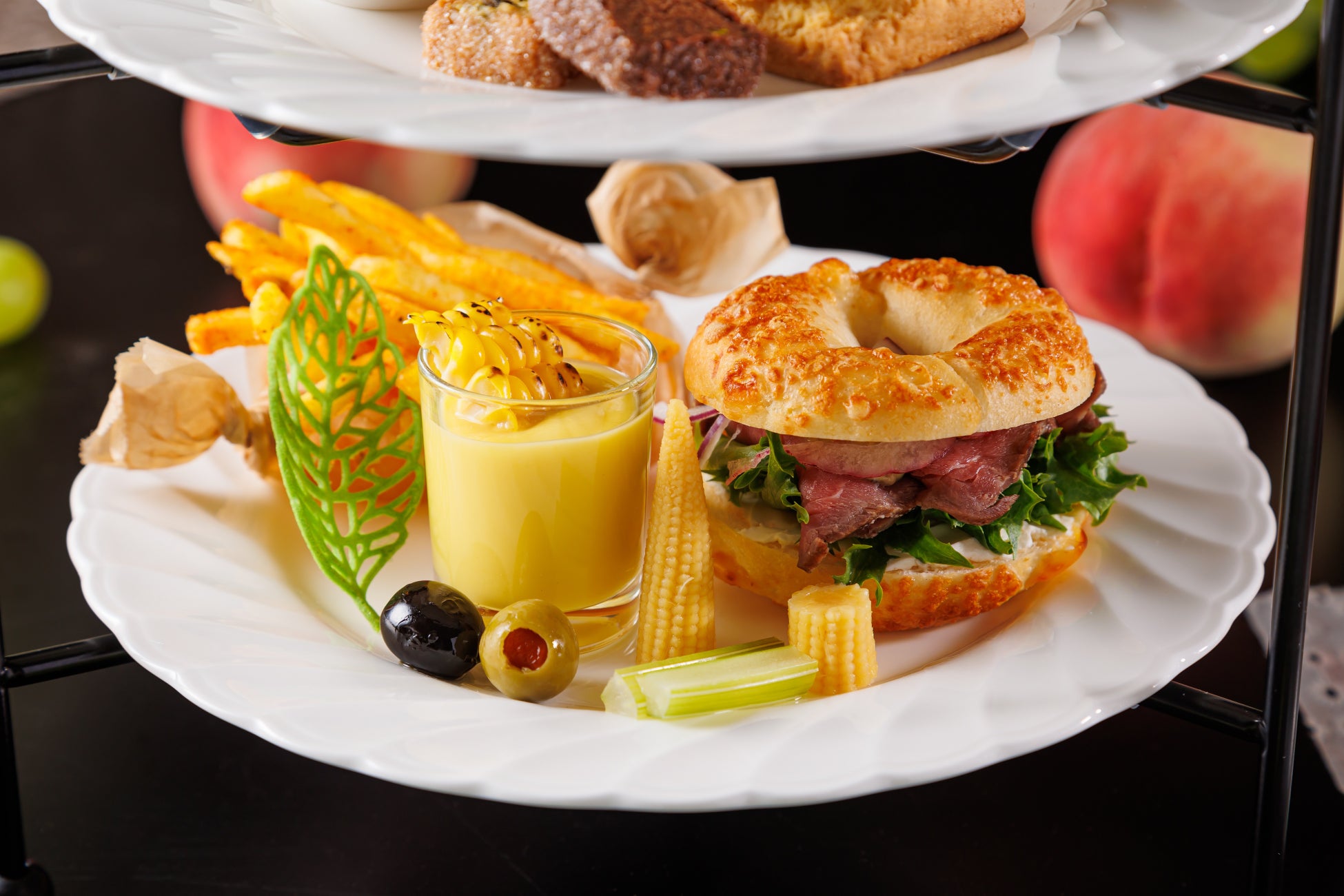 下段には見た目も可愛いセイボリーが4種。食べ応えのある「ローストビーフとクリームチーズのミニベーグル」、暑い季節にぴったりの「トウモロコシのヴルーテ」はトウモロコシの甘味がギュッと詰まっています。塩気のある「スパイシー風味のフライドポテト」や酸味の「ピクルス&オリーブマリネ」を間に挟みながらまたスイーツを楽しめます。