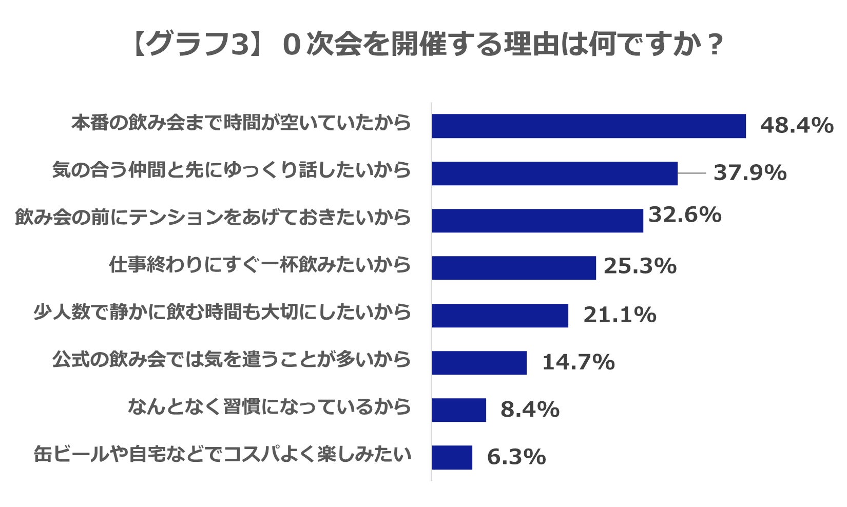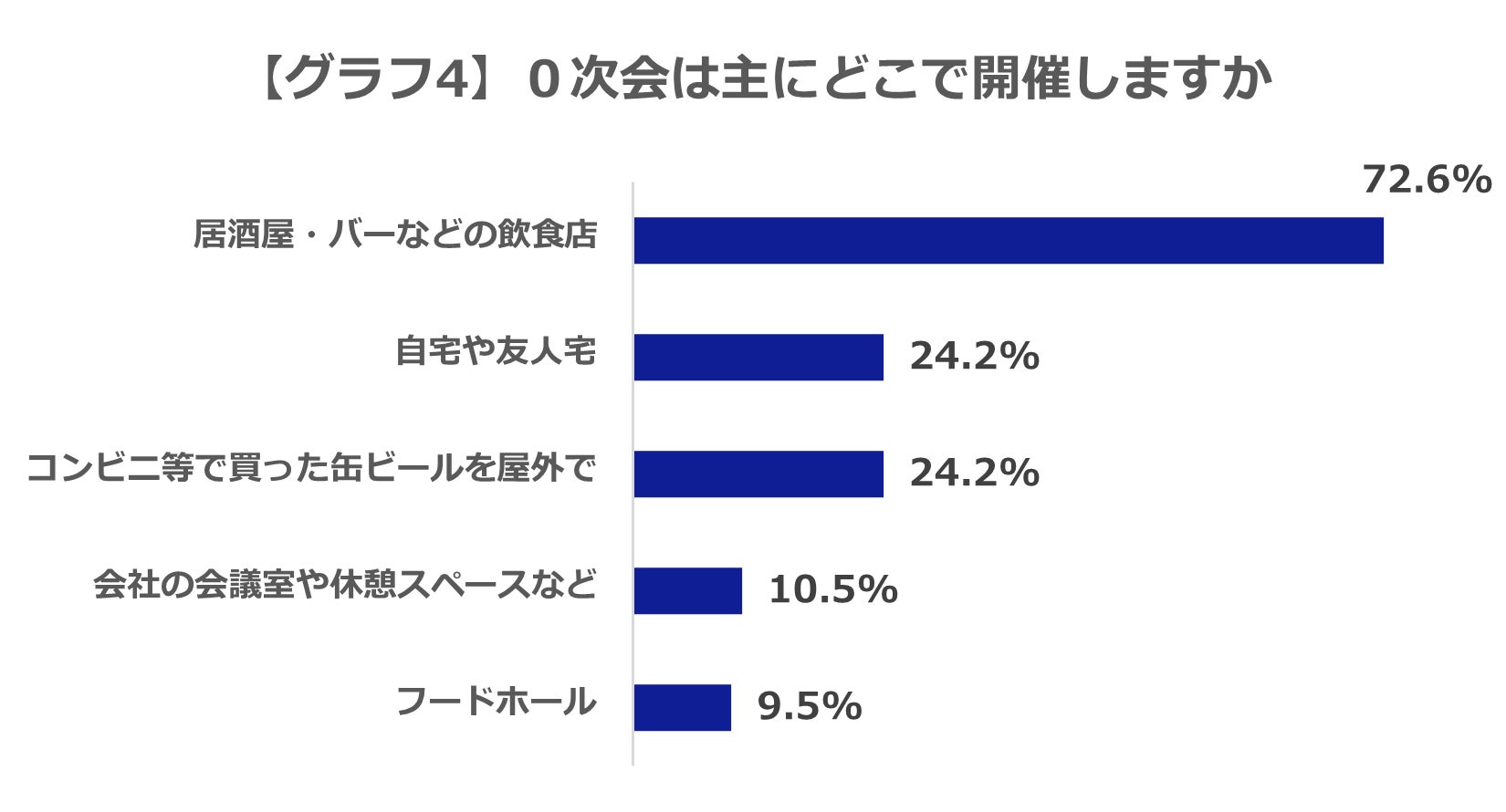 実施する理由としては「本番の飲み会まで時間が空いていたから」(48.4%)、「気の合う仲間と先にゆっくり話したいから」(37.9%)、「飲み会の前に軽くお酒を入れてテンションをあげておきたいから」(32.6%)、「仕事終わりにすぐ一杯飲みたいから」(25.3%)が上位に挙げられ、時間調整やリラックス目的で実施される傾向が見られました。開催場所としては、「居酒屋・バーなどの飲食店」(72.6%)が最も多く、次いで「自宅や友人宅」(24.2%)、「コンビニ等で買った缶ビールを屋外で」(24.2%)など、手軽に楽しめる場所が人気のようです。さらに、0次会の実施経験がない人のうち半数(50.3%)が「開催してみたい」と回答。年代別でみると、20代が約半数(48.6%)、30代が約6割(58.5%)と特に興味を示しており、0次会に対する潜在的な関心も高いことが明らかになりました。