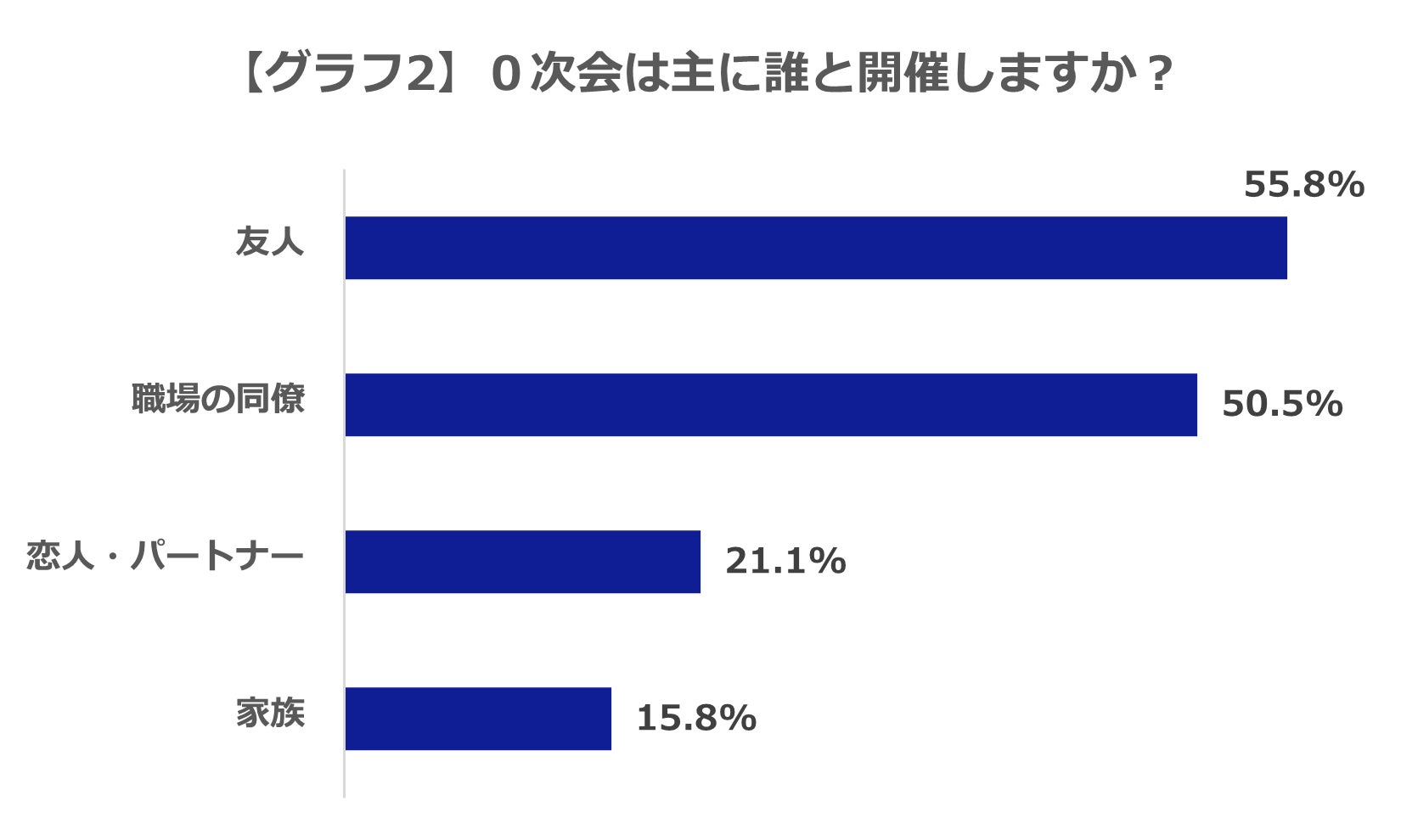 「0次会」とは、公式な飲み会(1次会)の前に、仲の良いメンバーでちょこっと集まって楽しむ、気軽なひとときのこと。今回、オリオンビールが沖縄県在住の20代~40代を対象に実施した調査の結果、「0次会を実施したことがある」と回答した人は約4割(37.1%)にのぼりました。0次会を行うメンバーは「友人」(55.8%)が最も多く、次いで「職場の同僚」(50.5%)となりました。