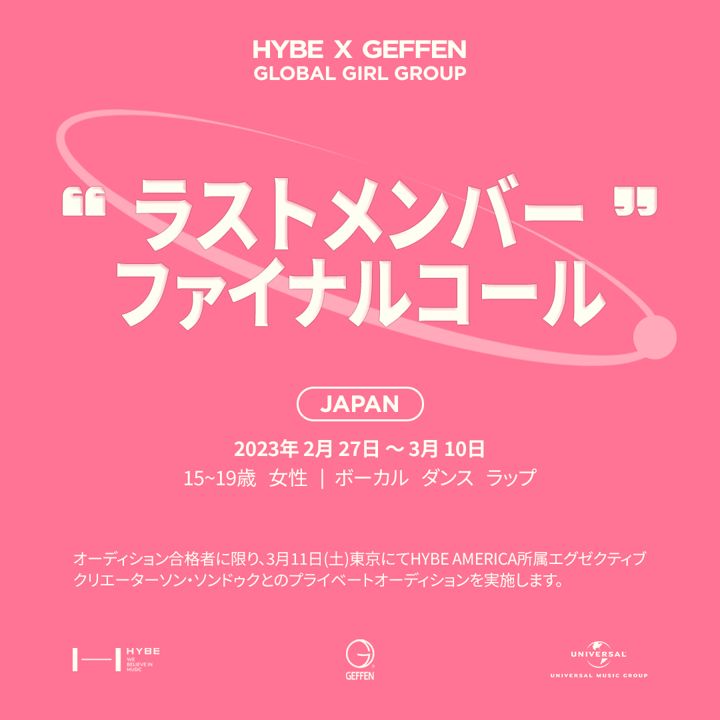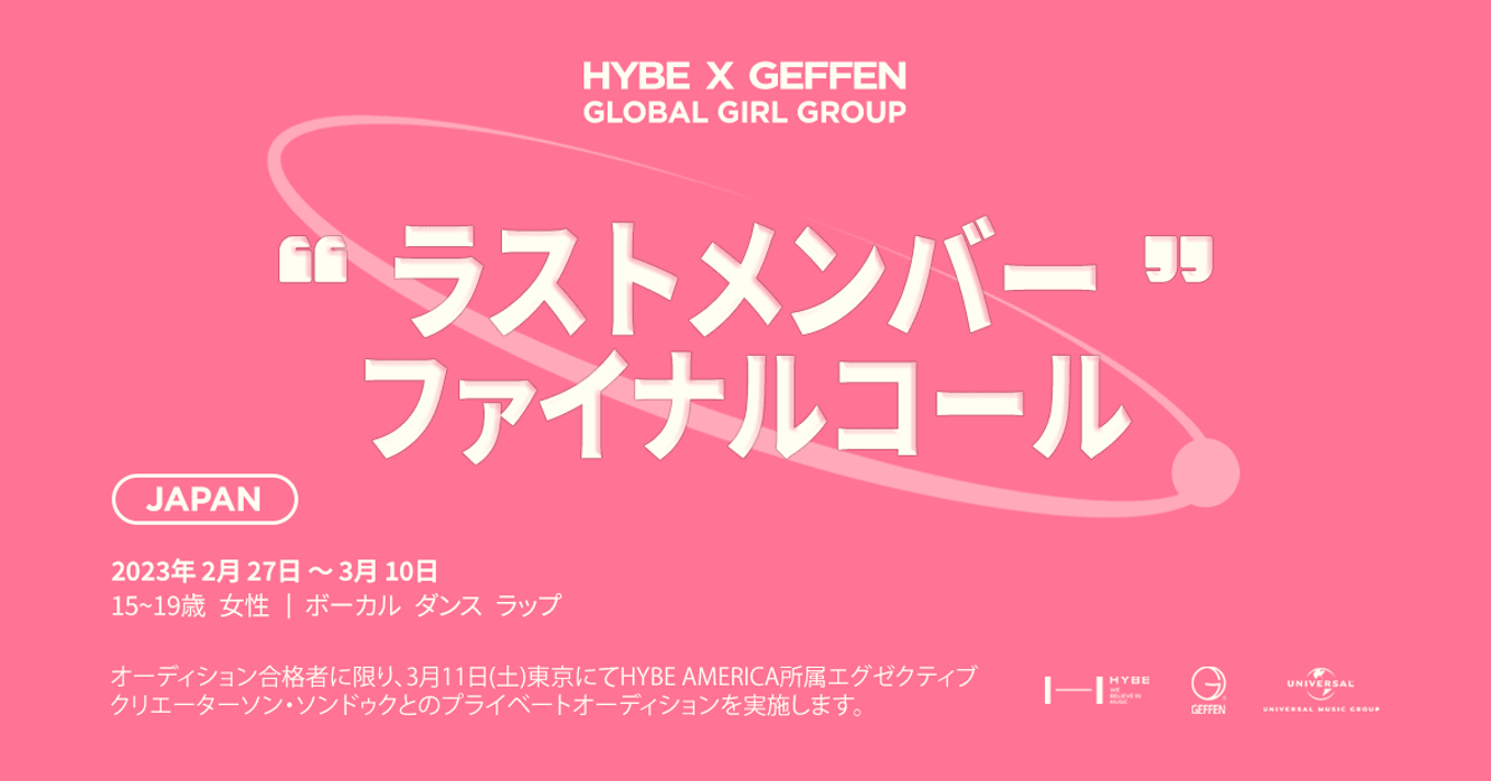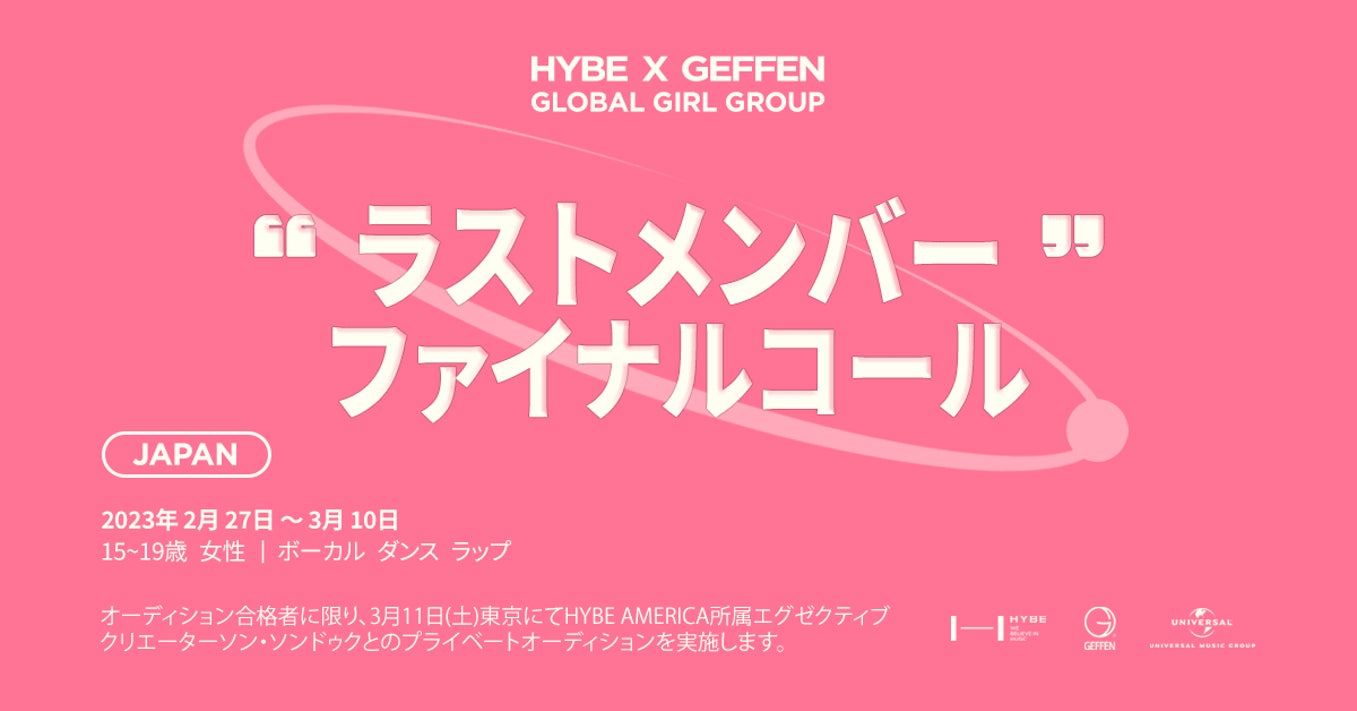 HYBEとユニバーサルミュージックグループによる「HYBE x GEFFEN グローバル・ガールグループ・プロジェクト」は、日本での最終オーディションを開催し、本日2月27日~3月10日までの期間、オンラインによる一次選考の応募を受け付けます。